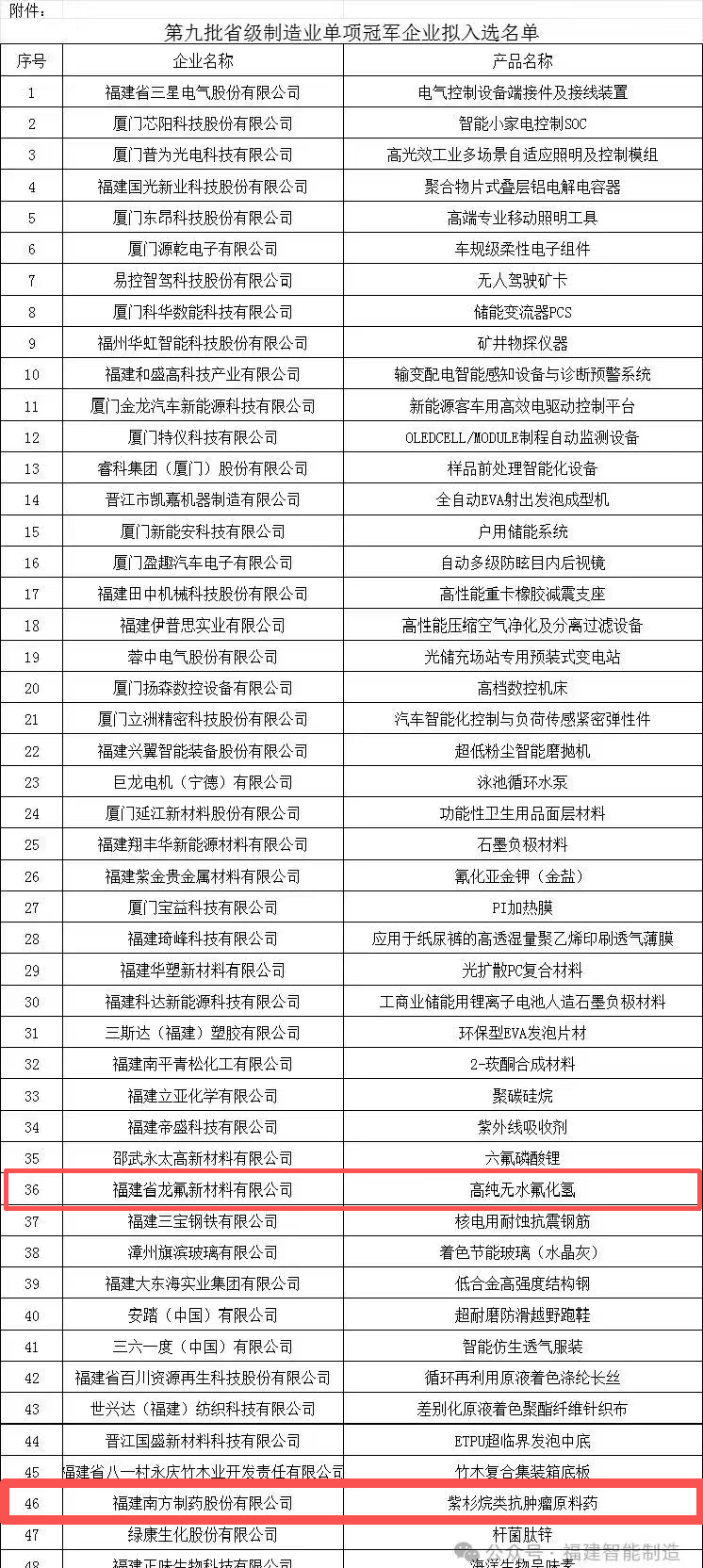 近日,福建省工业和信息化厅公布2025年福建省级制造业单项冠军企业名单,色情短视频 已投企业福建南方制药股份有限公司、福建德尔科技股份有限公司全资子公司福建省龙氟新材料有限公司入选名单。